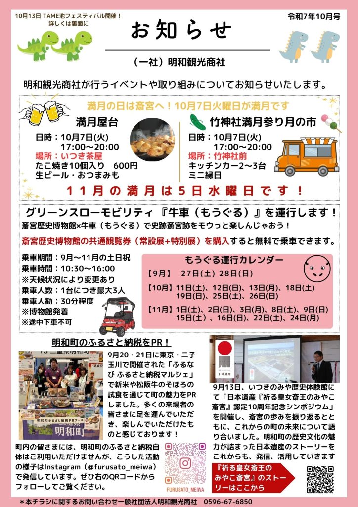 2025年10月1日 / 最終更新日時 : 2025年10月10日 [email protected] お知らせ 明和観光商社だより【10月号】を配布いたしました 明和町民の方たちを対象に、明和観光商社の取り組みを知っていただくため、【明和観光商社だより】を全戸回覧にて配布しております。 10月号を掲載いたします。