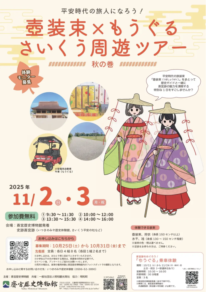 一般社団法人明和観光商社(所在地:三重県多気郡明和町斎宮、代表理事:千田良仁)は、斎宮歴史博物館(所在地:三重県多気郡明和町竹川)と、グリーンスローモビリティ「牛車(もうぐる)」を活用した史跡斎宮跡の周遊ツアー「平安時代の旅人になろう!壺装束×もうぐる さいくう周遊ツアー 秋の巻」を、令和7年11月2日(日)と3日(月・祝)に開催します。