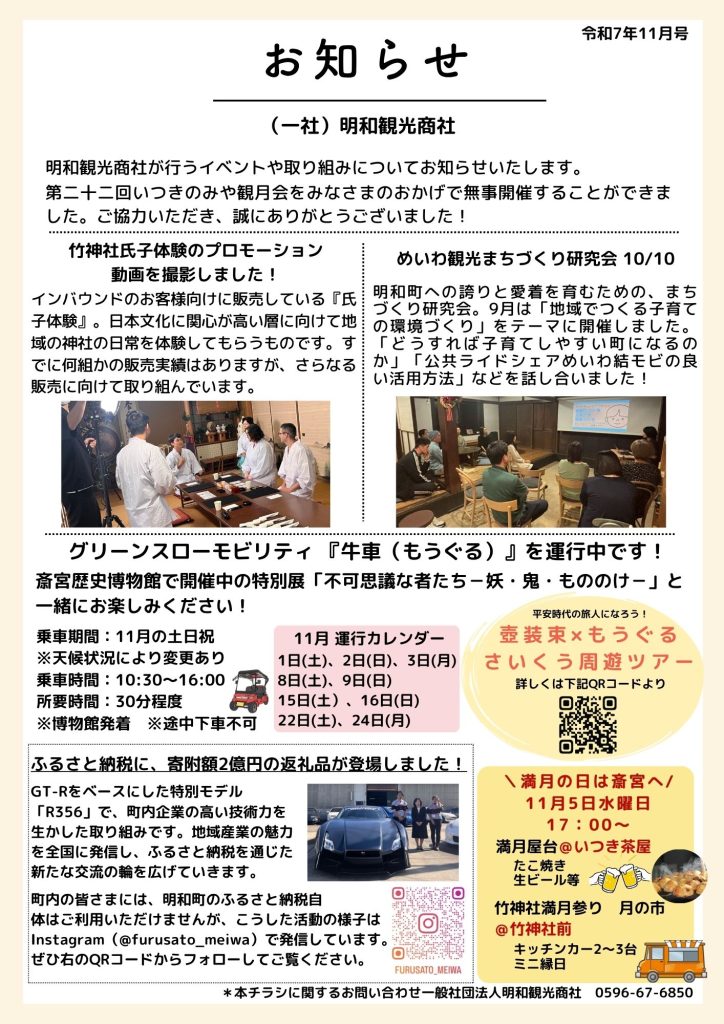 2025年10月27日 / 最終更新日時 : 2025年10月27日 [email protected] お知らせ 明和観光商社だより【11月号】を配布いたしました 明和町民の方たちを対象に、明和観光商社の取り組みを知っていただくため、【明和観光商社だより】を全戸回覧にて配布しております。 11月号を掲載いたします。