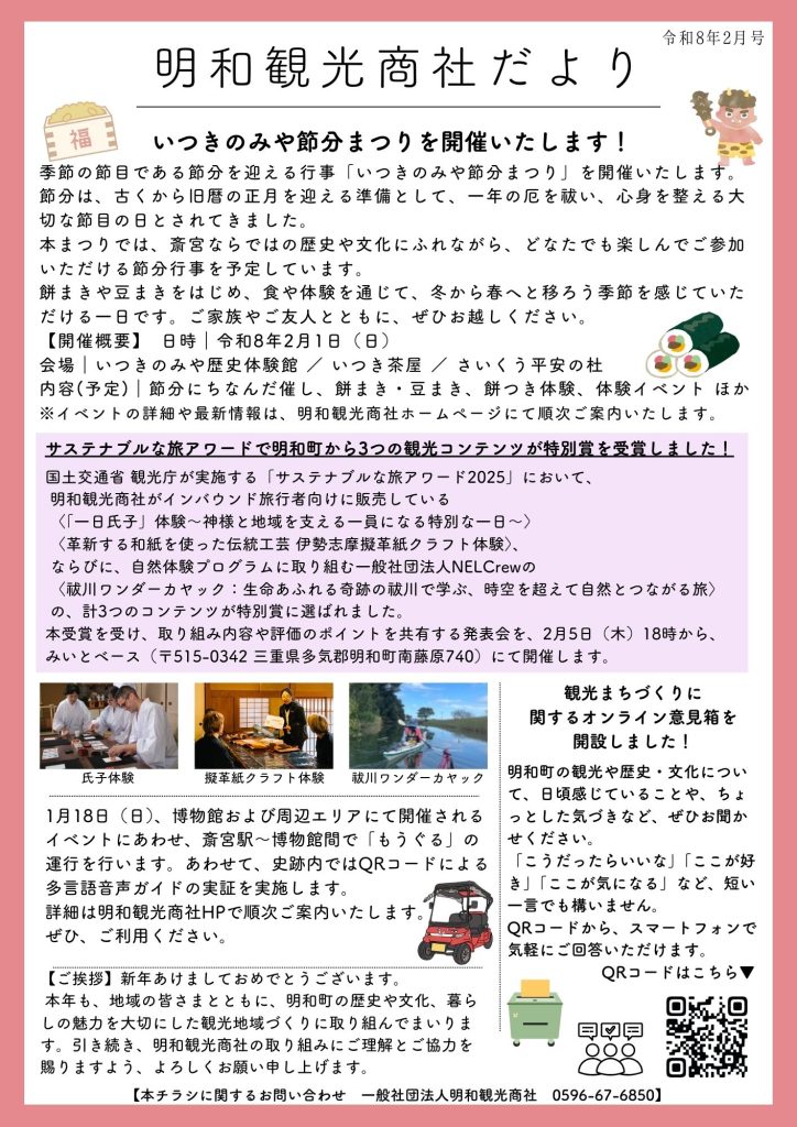 2026年1月13日 / 最終更新日時 : 2026年1月13日 [email protected] お知らせ 明和観光商社だより【2月号】を配布いたしました 明和町民の方たちを対象に、明和観光商社の取り組みを知っていただくため、【明和観光商社だより】を全戸回覧にて配布しております。 2月号を掲載いたします。